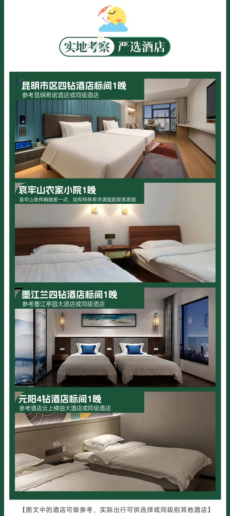 ● 工作人员将根据住宿预定情况进行排房,拼房原则为同性别团友拼房。如需跟家人/朋友同住一间房的,需在报名后告知工作人员。如单人报名要求单独住一间房的,需联系工作人员确认是否能安排,如可安排,单房差费用自理。