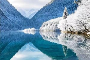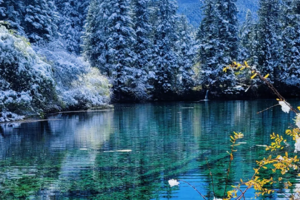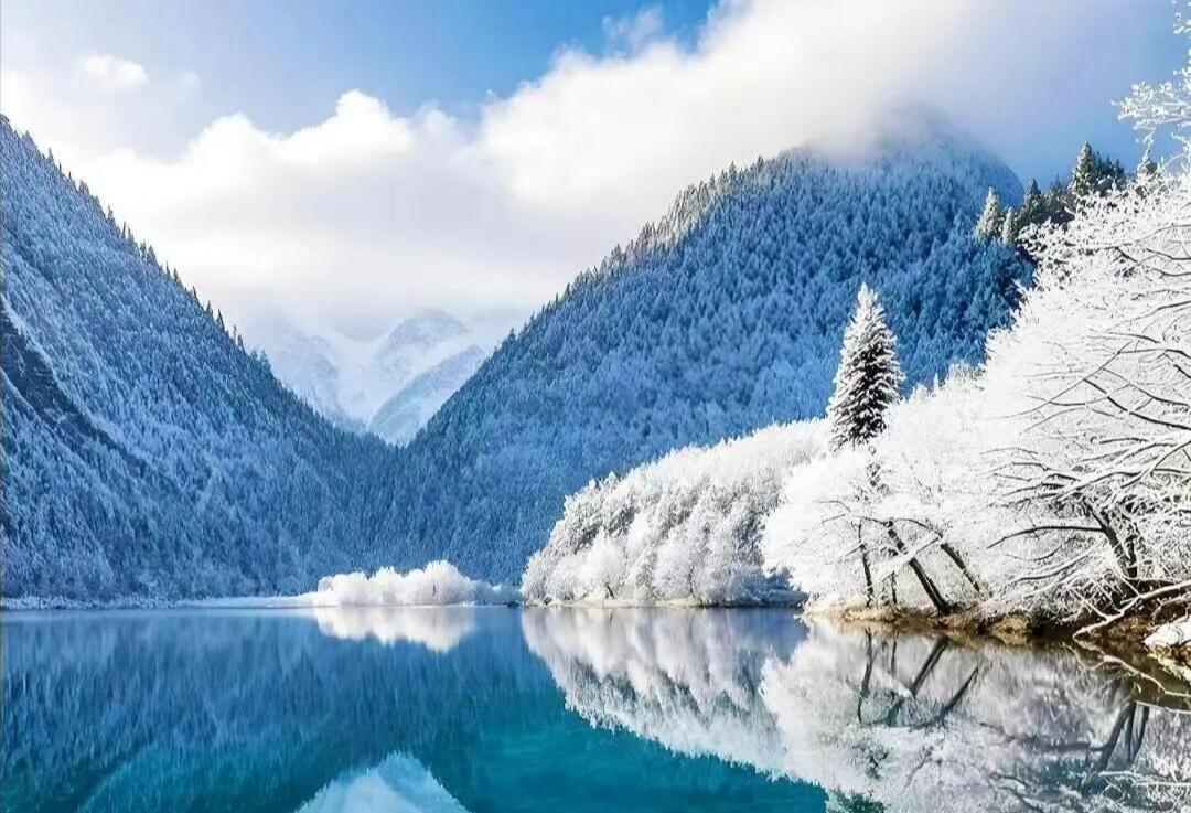 未结冰的蓝色湖水与白茫茫的芦苇丛