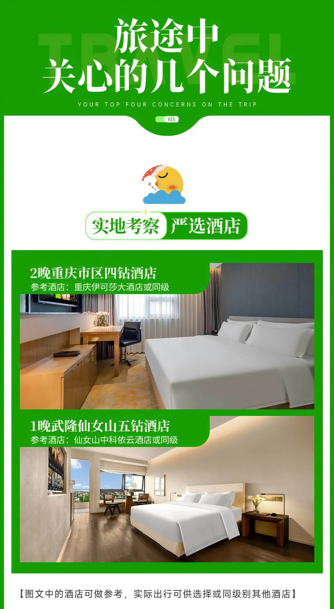 3、 行程中的所列的酒店类型,2星/2钻=经济型;3星/3钻=舒适型;4星/4钻=高档型;5星/5钻=豪华型;意为评定或条件到达相应标准的酒店,少部分地区,由于政策等因素,可能存在酒店条件满足,但未进行星钻评定的情况;
