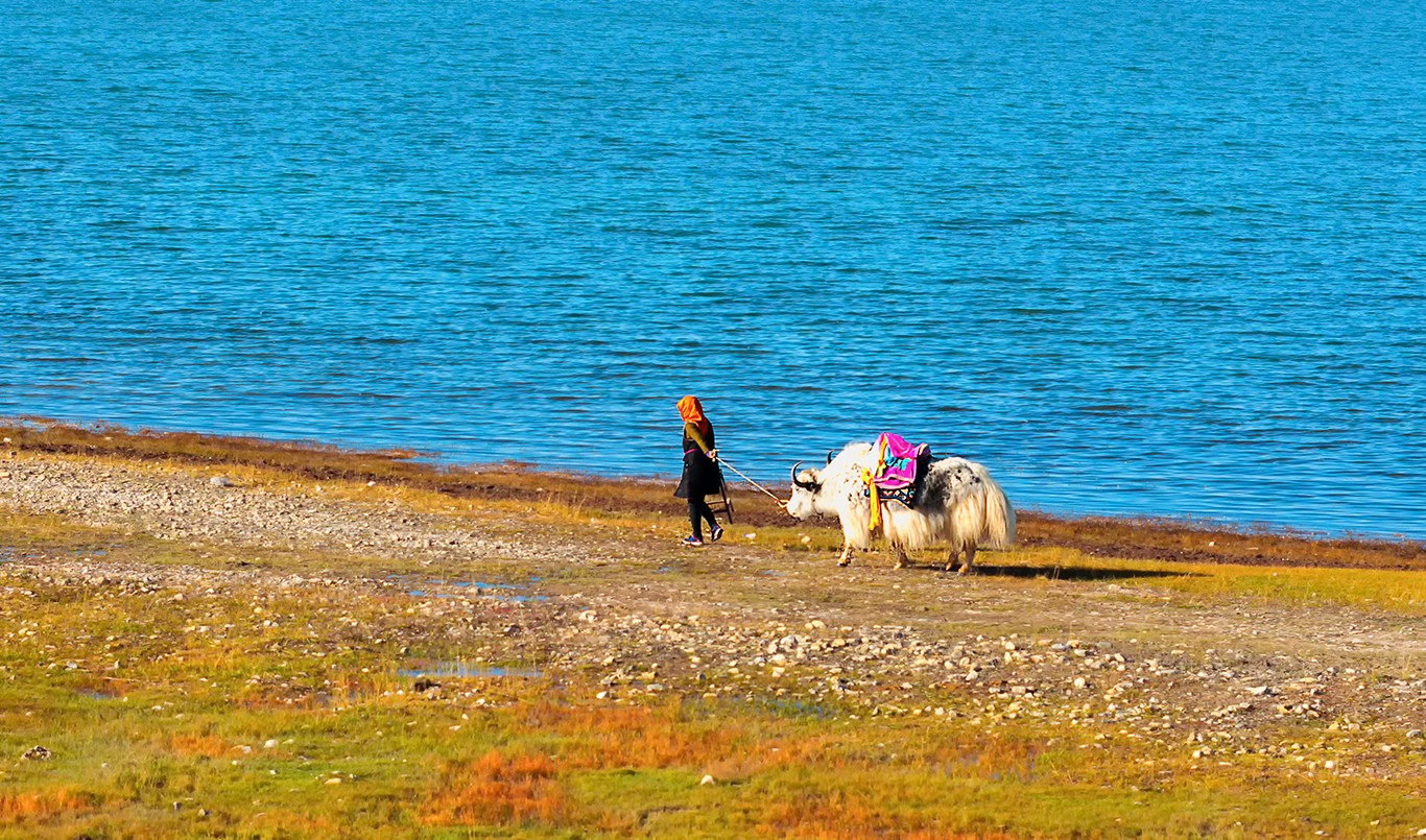 湖面纯净,远处雪山倒影,肃静一片映射天空的云彩和碧蓝,恍如隔世在这里,天是湖的一部分湖是天的补充,似真似幻