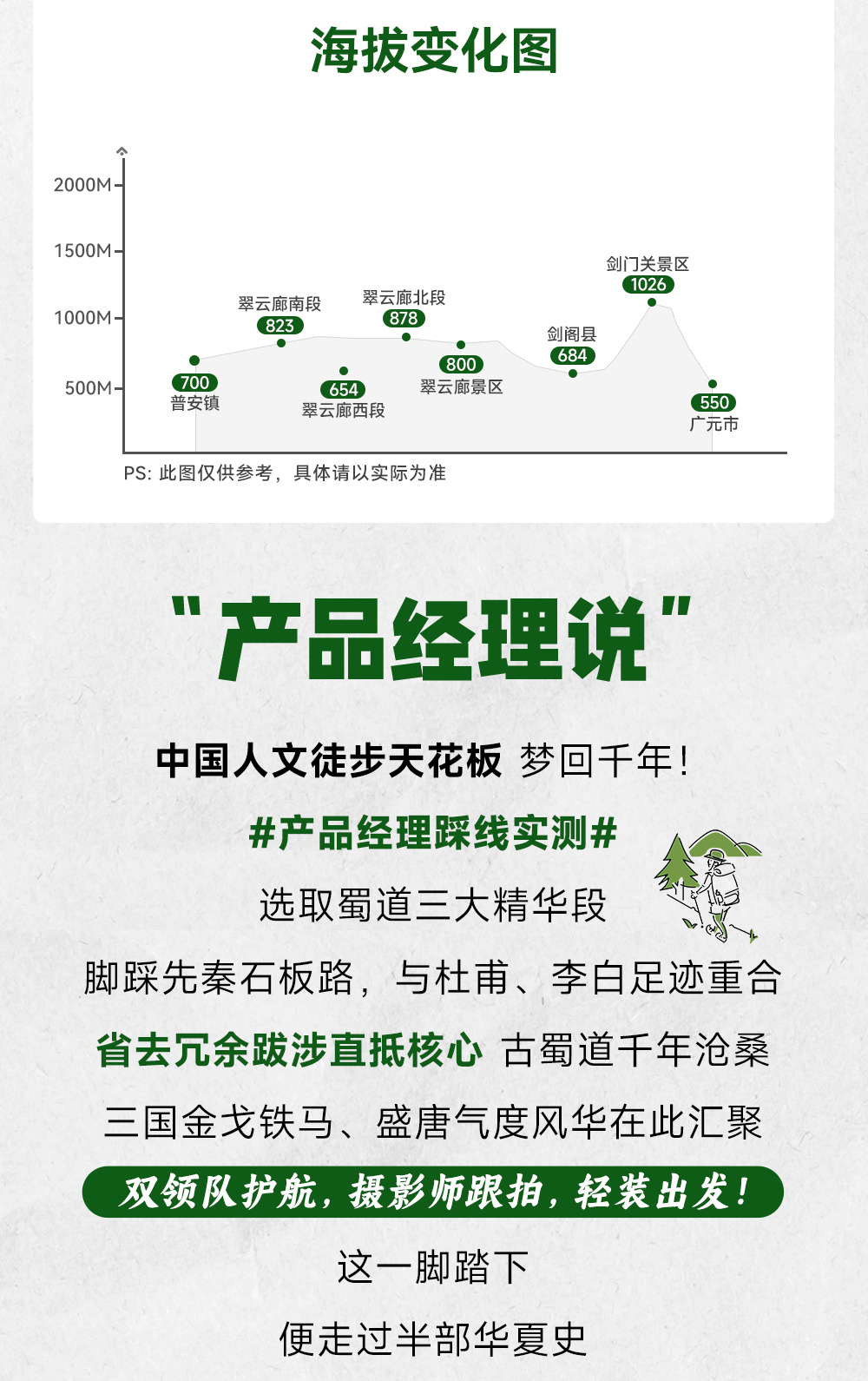 1.本线路为联营产品(嘻ha合作伙伴操作),确定团期报名前先和客服沟通确认余位/余房情况,再购买机票等大交通,否则因未成团或满员造成退票损失,将由队员方承担。(客服电话/微信18729066114)2.户外徒步活动均为未开发的野山,活动途中可能会有不确定因素及风险(比如部分路段陡峭/湿滑等),有恐高/体力弱者/户外小白新手/心理承受能力弱的朋友禁止报名;3.绿卡仅限本人使用;购买前请确认好费用部分及退费规则,不遵守图文规则请勿参团;4.联营线路不参与其他优惠【徒步华夏第二十五站·古蜀道5日】