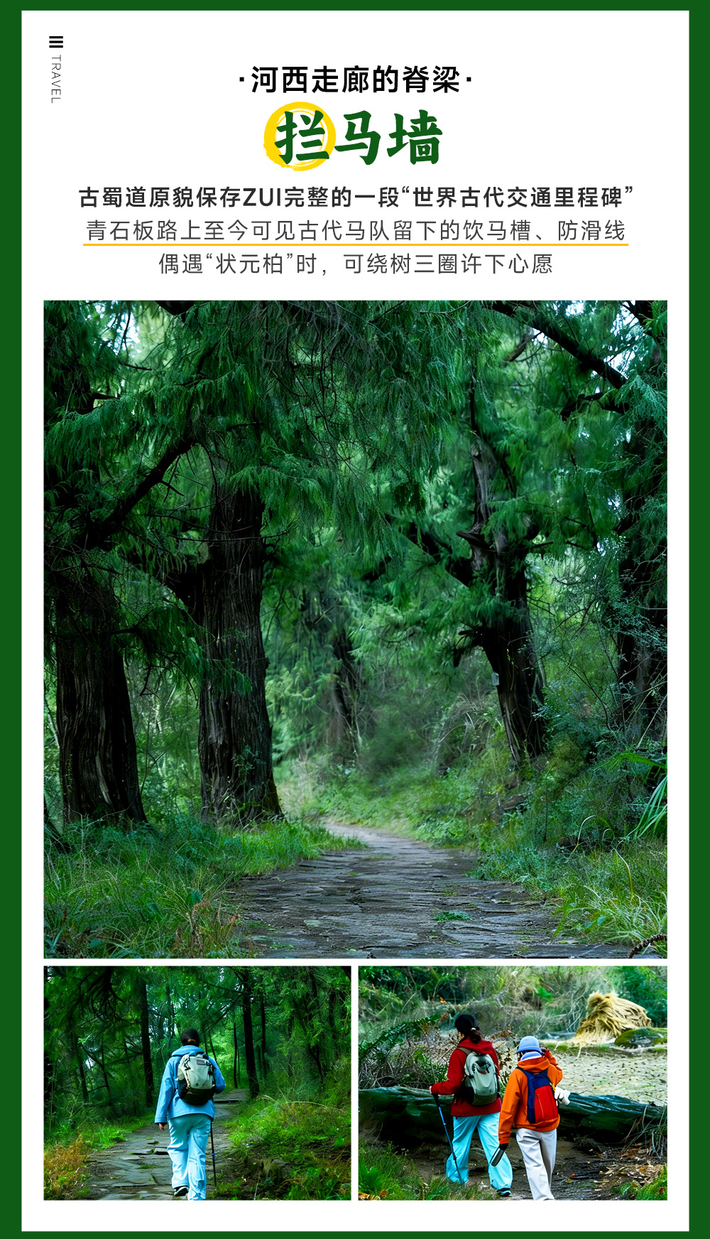 接着我们乘车前往翠云廊西线徒步起点拦马墙蜀道入口处(车程约1小时,24公里)。拦马墙是先秦金牛古道的险要段,传蜀汉张飞为防驿马坠崖,令将士筑墙,故称拦马墙;明代大规模补植古柏、加固墙体,是古代陆路交通的 “防护工程” 典范。西线徒步为(拦马墙-普安镇6公里)这是金牛古道保存最完好、人文与自然景观兼备的精华段,也被称作 “蜀道活化石”。核心精华段是拦马墙 — 清凉桥(约 3.5 公里)。