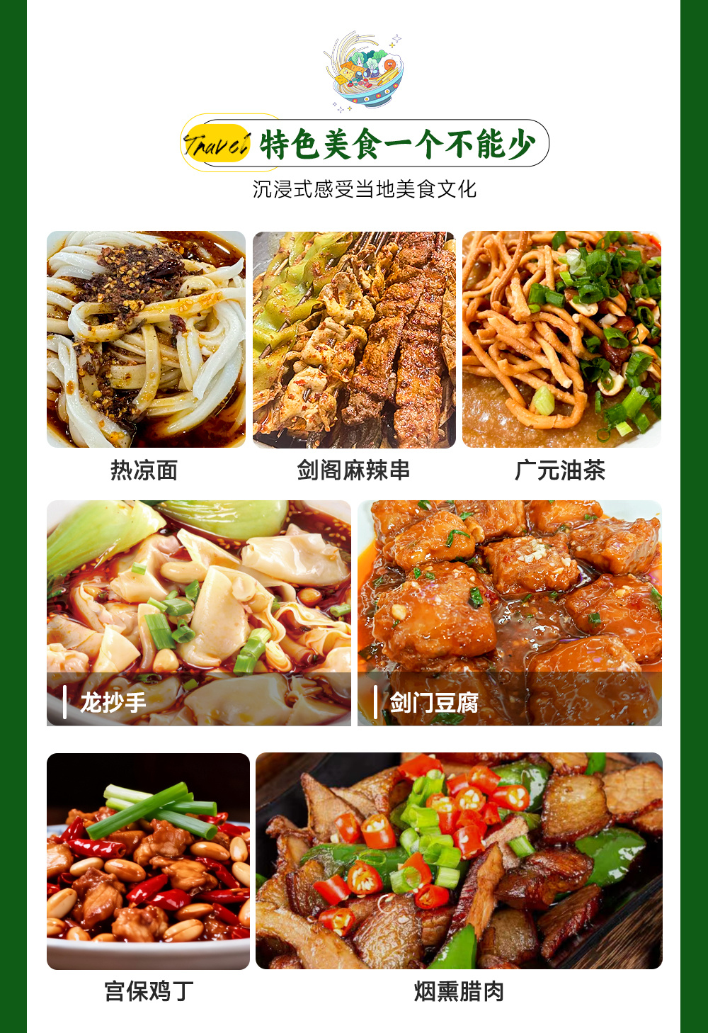 推荐美食:麻辣串(市级非遗)、剑门土鸡宴、米豆腐、核桃饼、豆腐宴等