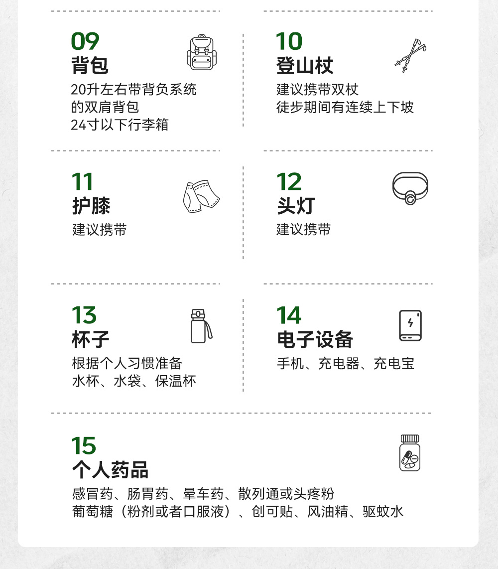 ③另根据自身需要,携带遮阳帽、手套等!